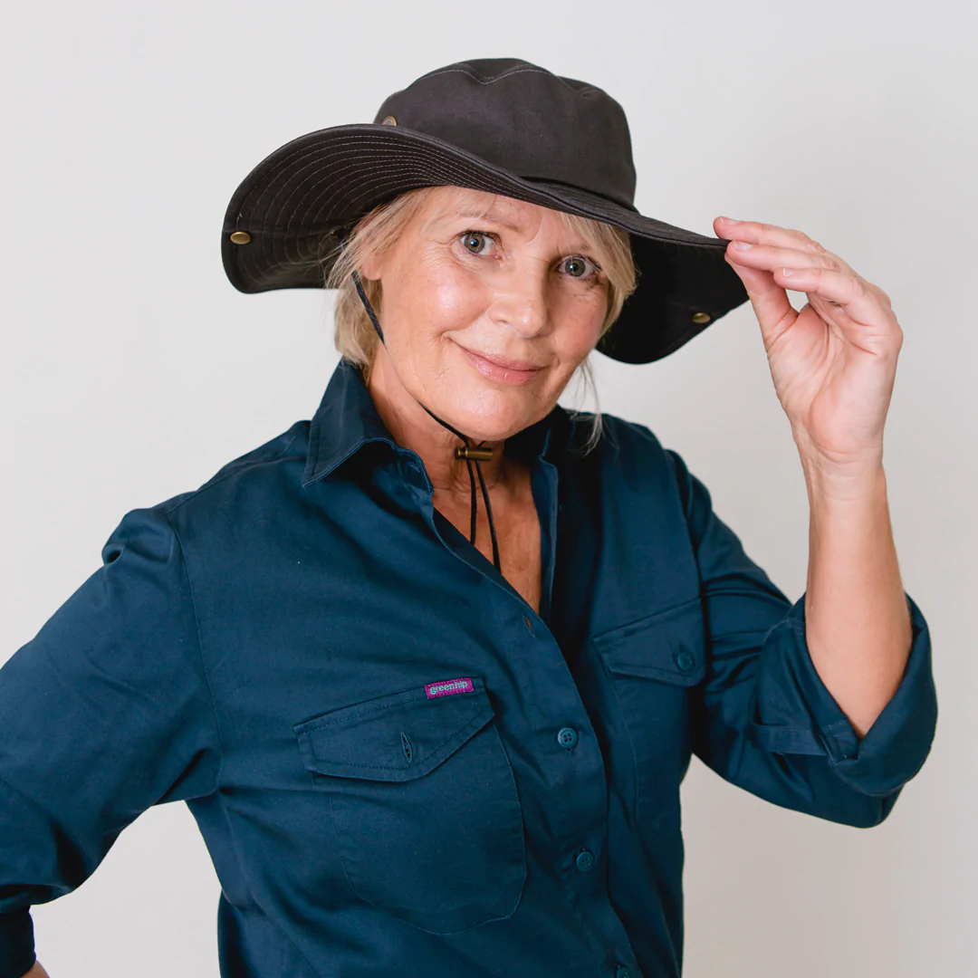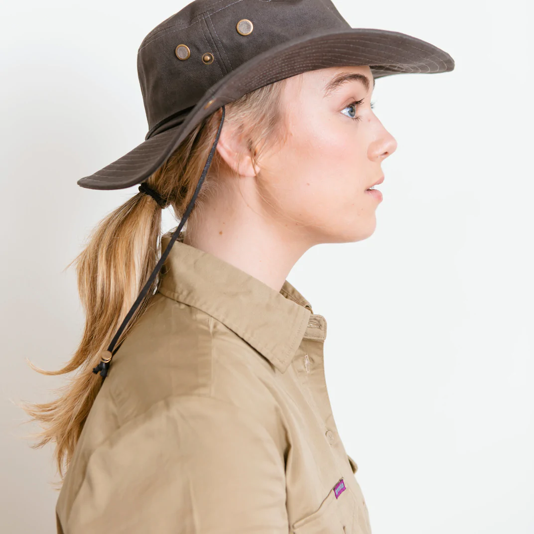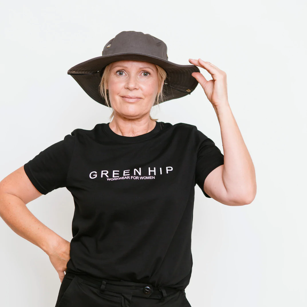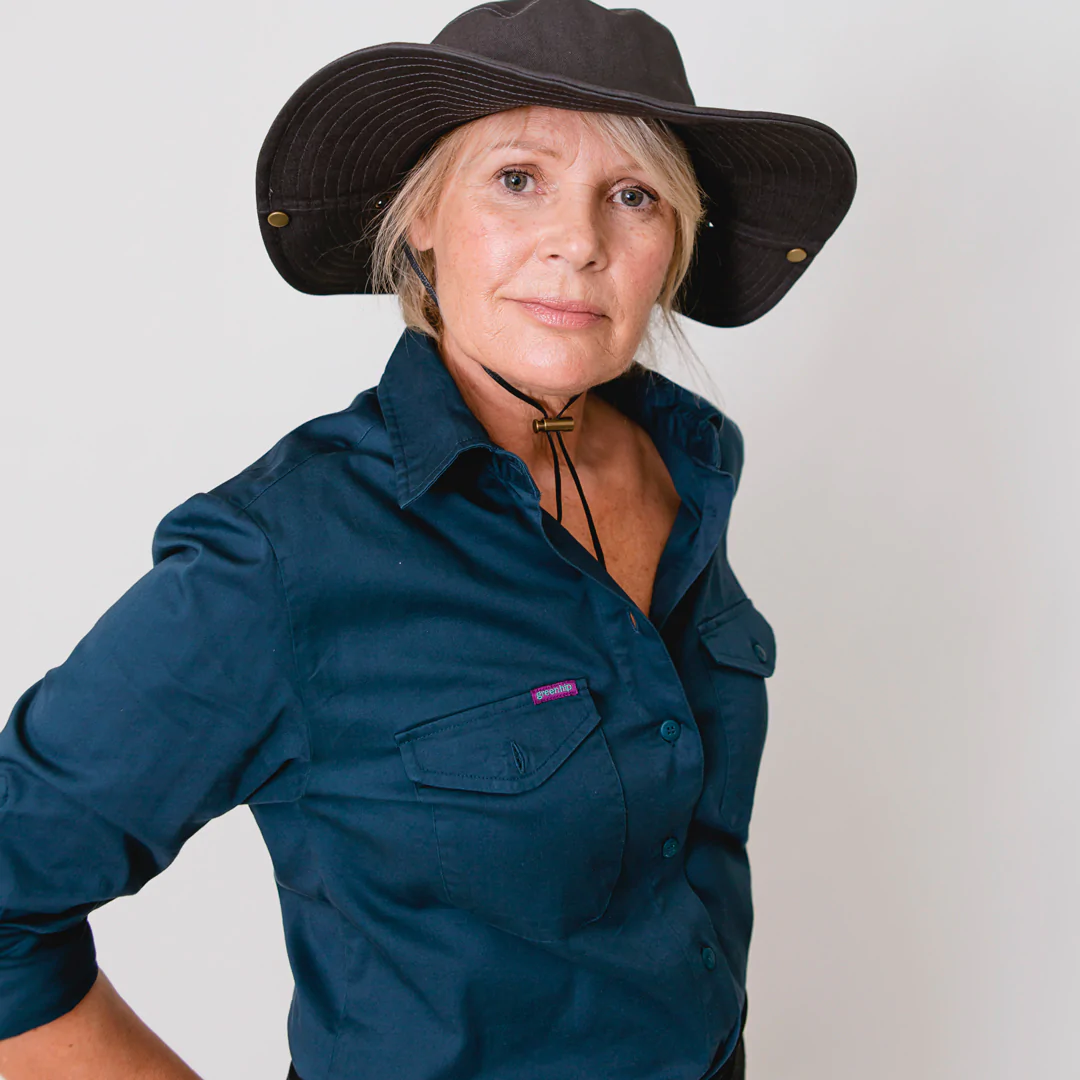 Protect yourself from the elements in style with this Green Hip Broad Rim Hat. Designed for outdoor work, it features eyelit holes for ventilation, a built-in sweatband, and a drawstring for a snug fit.